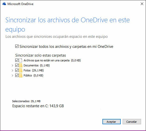 Si no quiere sincronizar todos a OneDrive con su PC, puede elegir algunas carpetas.