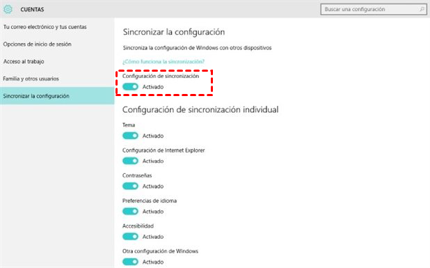 3. Haga clic en Sincronizar la Configuración. Active Configuración de sincronización. Desactive cualquier configuración individual si desee que ciertas cosas no se sincronicen.