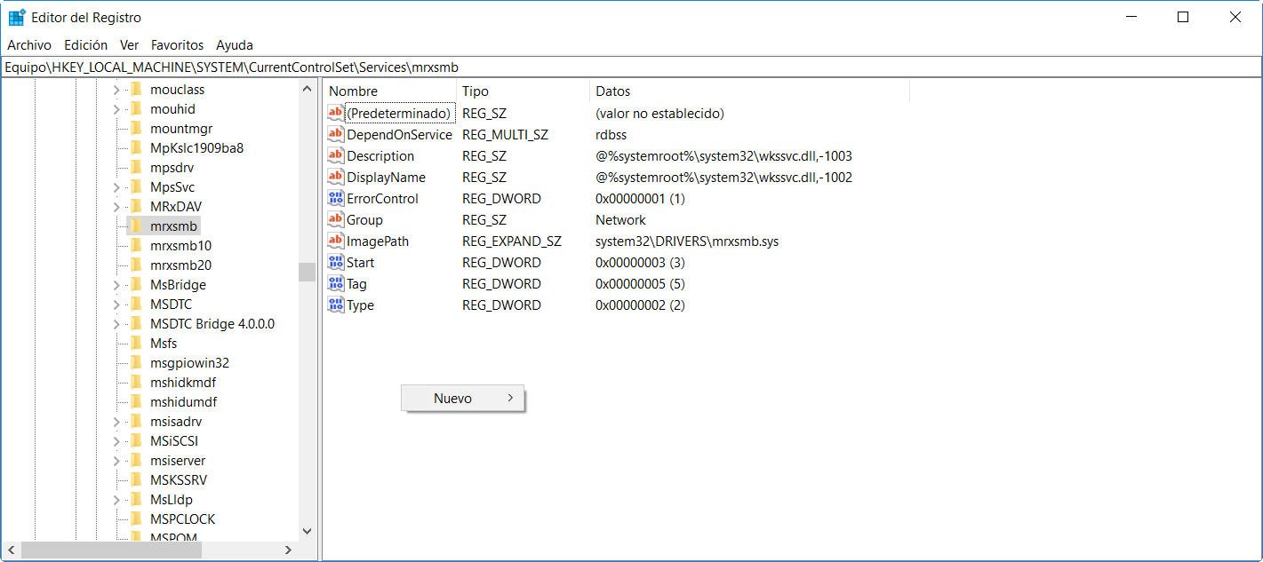 NOTA: Crear una nueva clave titulada Parameters si no lo hay en MRXsmb