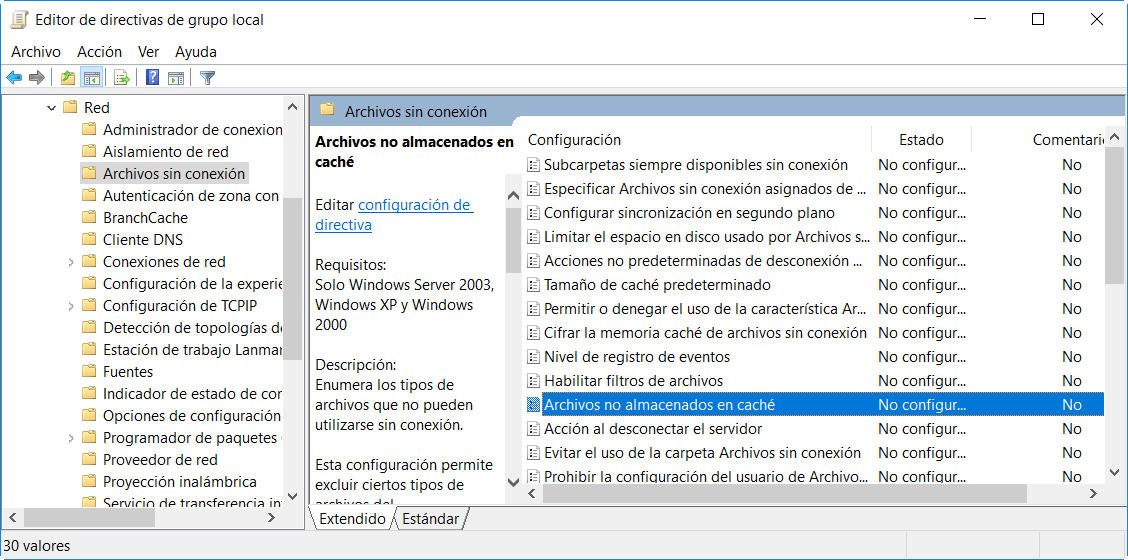Configuración del equipo\Pantanilla administrativa\Red\Archivos sin conexión\Archvios no almacenados en caché