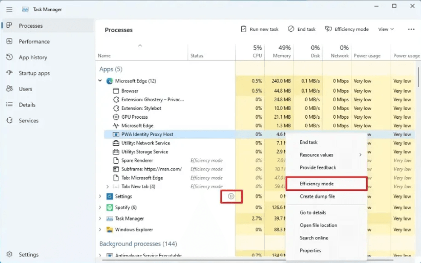Windows 11 22H2 tiene un nuevo Administrador de tareas con un diseño coherente con el estilo del escritorio. Cada página tiene una nueva barra de comandos para acceder a las operaciones diarias. Microsoft ha añadido incluso un tema oscuro al nuevo Administrador de tareas. El Administrador de tareas también incluye ahora una nueva función de modo "Eco Mode" que resultará muy útil cuando notes que una aplicación consume muchos recursos y quieras limitar su consumo, permitiendo al sistema dar prioridad a otras aplicaciones.