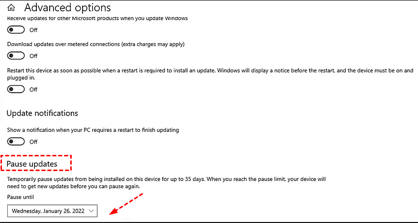 3. Para pausar las actualizaciones de Windows 11 durante más de 7 días, haz clic en "Opciones avanzadas". Luego, en la siguiente ventana, desplázate hacia abajo hasta "Pausar actualizaciones" y selecciona una fecha en el menú desplegable. Esto pausará temporalmente las actualizaciones para que no se instalen en este dispositivo durante un máximo de 35 días.