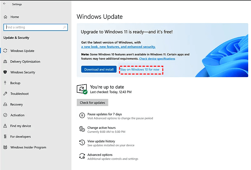 2. Luego, verás que "Actualizar a Windows 11 está listo" si tu computadora cumple con los requisitos del sistema para Windows 11. Haz clic en "Permanecer en Windows 10 por ahora". Alternativamente, desplázate hacia abajo hasta "Pausar las actualizaciones durante 7 días" y selecciónalo.