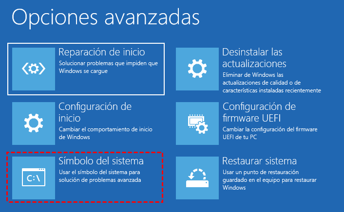 2. Seleccione Solucionar problemas > Opciones avanzadas > Símbolo del sistema.