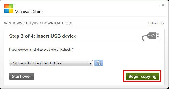 Paso 3. Inserte su memoria USB en el ordenador de funcionamiento y selecciónelo. Luego, haga clic en "Iniciar copiando" (Begin copying). Cuando finaliza todo el proceso, puede obtener una memoria USB de recuperación.