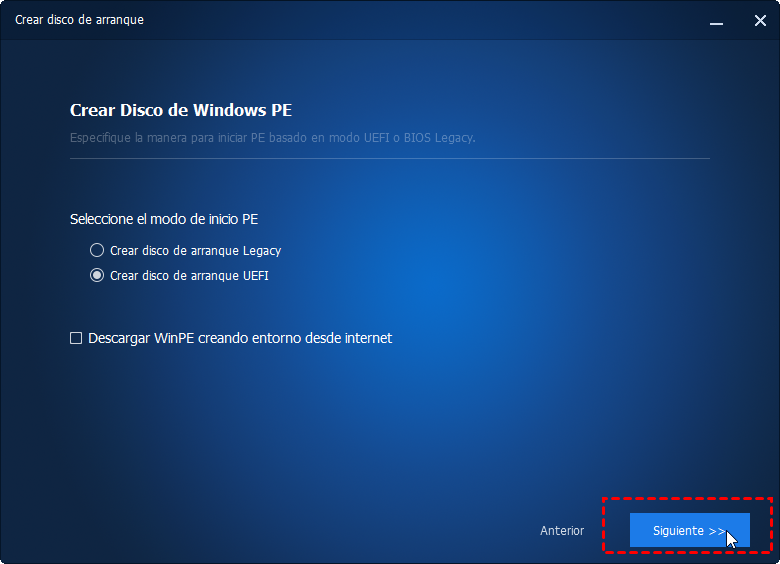Paso 2. En esta ventana, seleccione el tipo de medio de arranque. Se sugiere elegir Windows PE para obtener un mejor rendimiento. Soporta tanto el modo UEFI/GPT como el modo Legacy BIOS/MBR.
