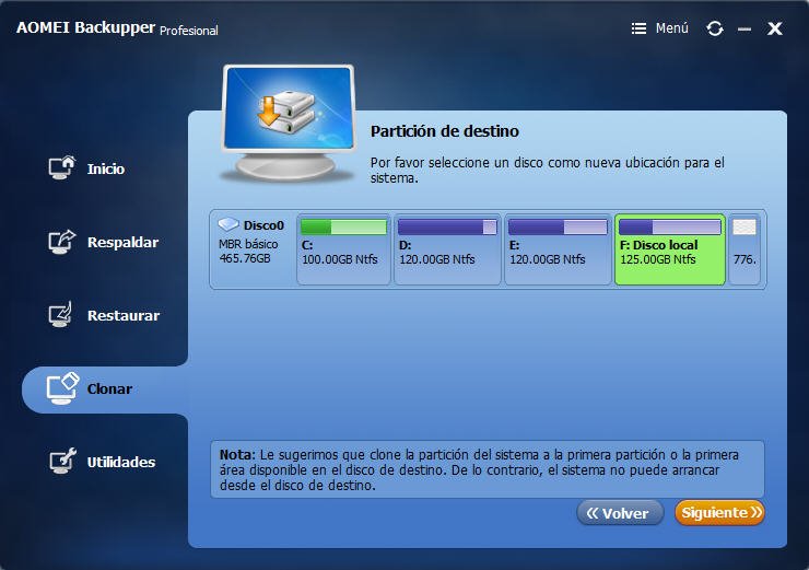 Si se encuentra en ese caso, es mejor que utilice un software de clonación de discos para clonar el HDD a SSD directamente. De forma predeterminada, AOMEI Backupper solo clona sectores usados, por lo que puede clonar fácilmente un HDD grande a un SSD más pequeño, así como clonar un disco más grande a un disco más pequeño.