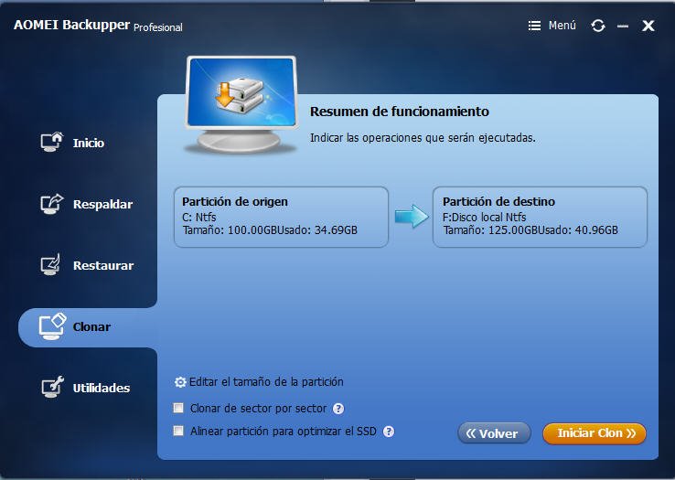 • No marque "Clonar sector por sector" si el espacio utilizado en el disco de destino es menor que el del disco de origen, de lo contrario el proceso de clonación fallará.