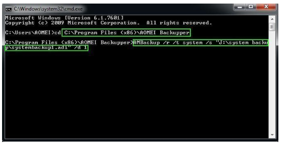 ① Para restaurar la imagen del sistema "systembackup1.adi" guardada en J:\systembackup al disco 1. El comando debe ser: AMBackup /r /t system /s "J:\system backup\systembackup1.adi" /d 1.