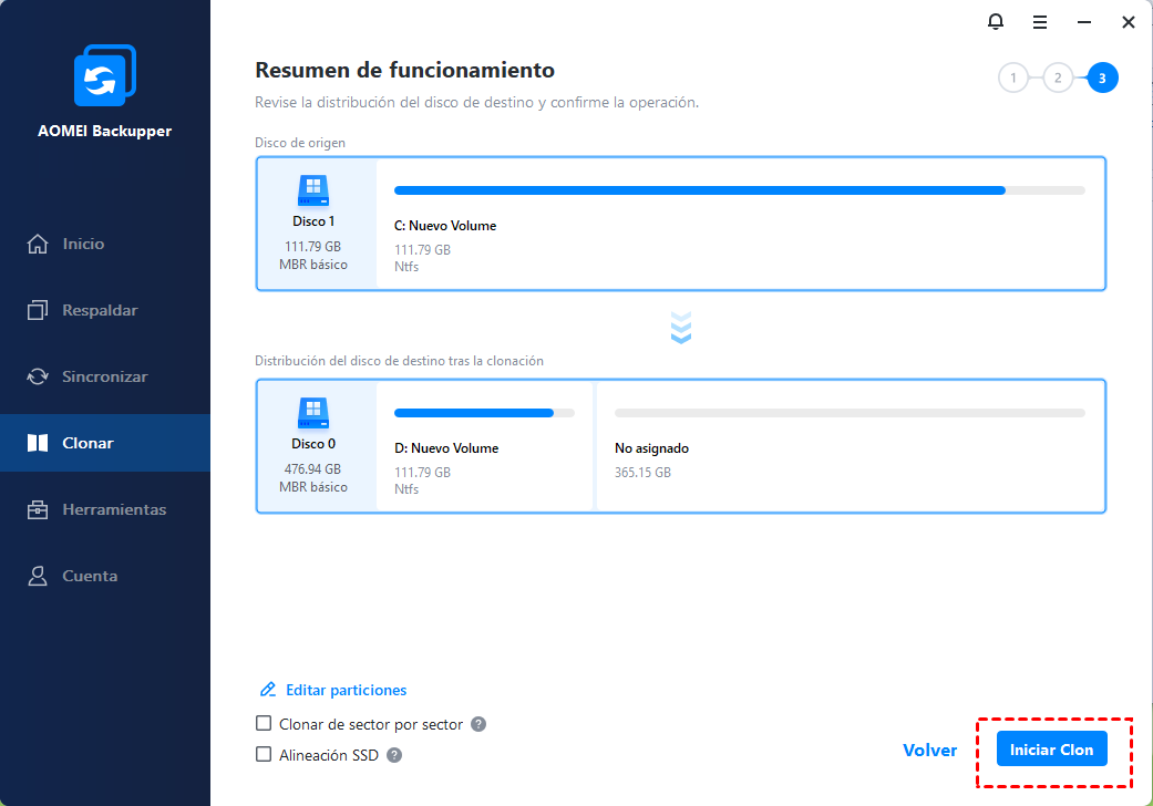 ● "Clon por sectores" clonará todos los sectores de un disco duro sin importar si está usado o no y tardará más tiempo. Selecciónelo si clona un disco cifrado o si los datos del disco de origen están dañados pero desea restaurarlos.
