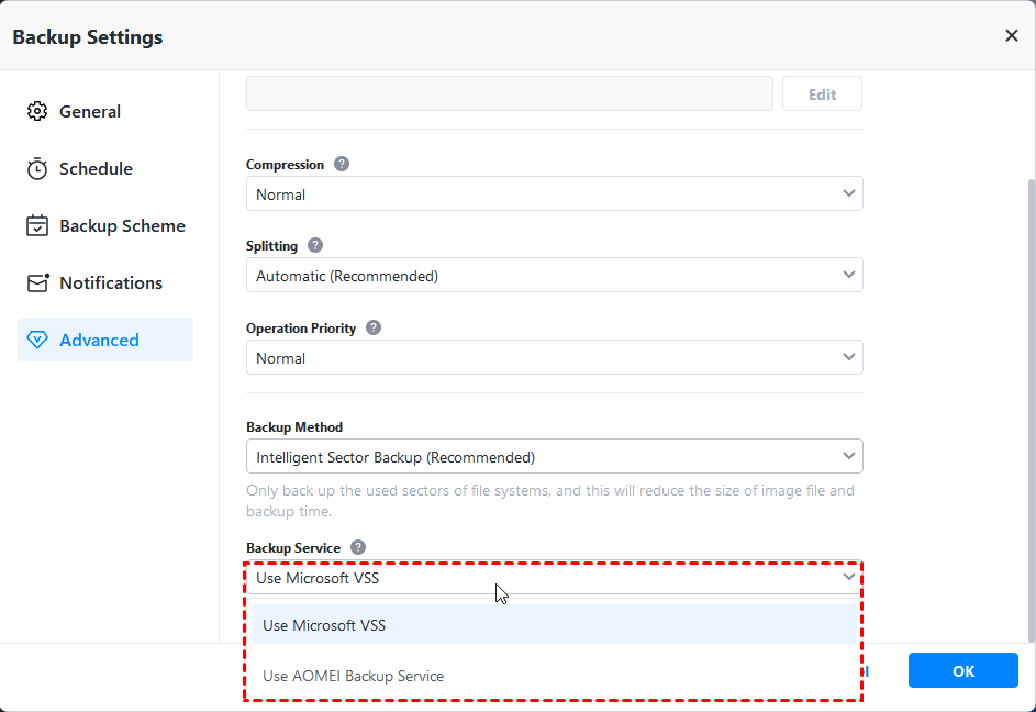 ✫ Soporta el servicio de copia de seguridad Microsoft VSS y el servicio de copia de seguridad de AOMEI, por lo que puedes realizar copias de seguridad de cualquier elemento sin interrupciones y sin limitaciones del sistema de archivos. Además de NTFS, aún puedes utilizarlo para hacer copias de seguridad de particiones formateadas con FAT32/FAT16, exFAT/ReFS, Ext2/Ext3/Ext4 y otros sistemas de archivos.