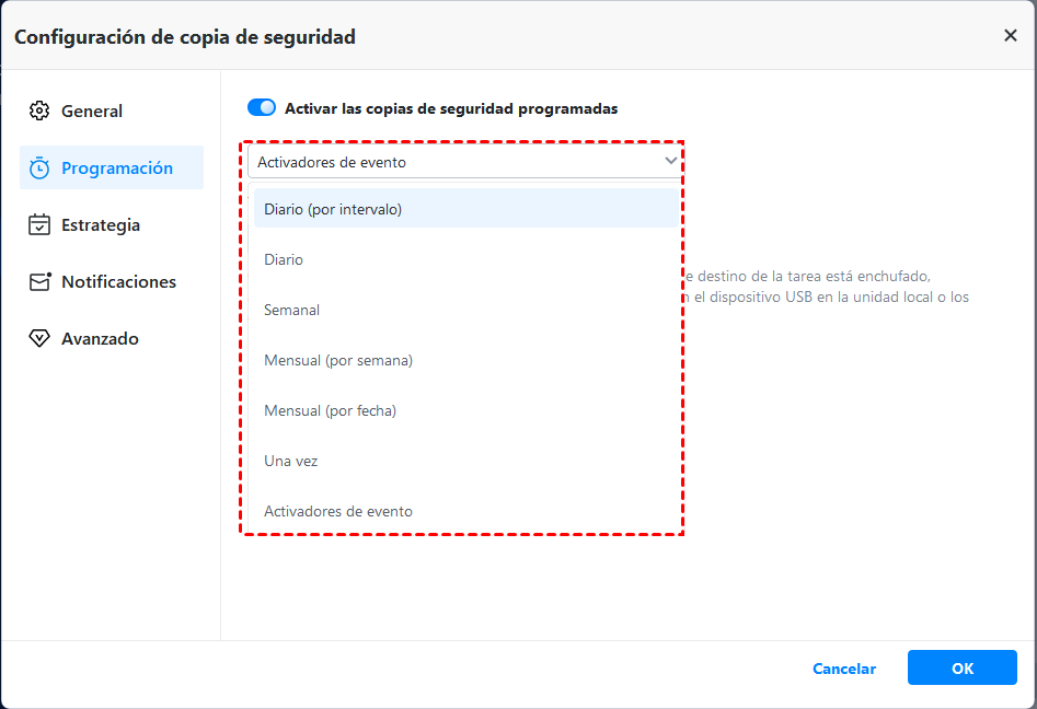3. Luego puedes hacer clic en Programación para decidir cuándo quieres que se ejecute la tarea y hacer clic en OK para confirmar. En esta ventana Configuración de programación, puedes hacer clic en Avanzado para elegir una forma (copia de seguridad completa/incremental/diferencial) para realizar la copia de seguridad.