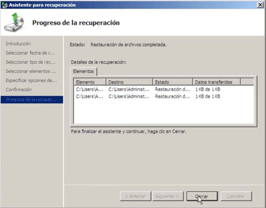 Paso 7. En el paso de Confirmación, asegúrate de haber elegido los archivos correctos. A continuación, haz clic en Recuperar. Espera a que finalice el proceso. Después, cierra el Asistente para la recuperación.
