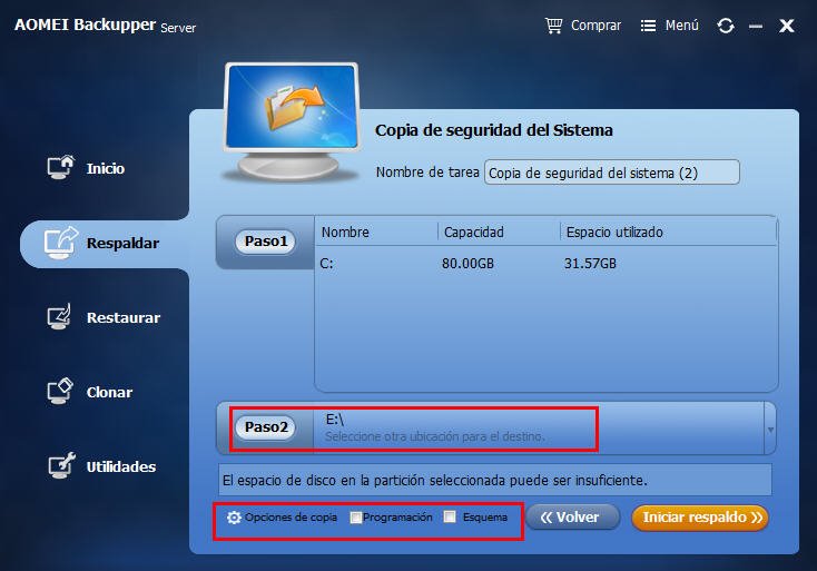 4. Especifique el tipo de destino entre disco de copia de seguridad, volumen de copia de seguridad o carpeta compartida de red. Si selecciona un disco duro completo como disco de copia de seguridad, el disco duro se reformateará, así que asegúrese de que no hay datos importantes en él.