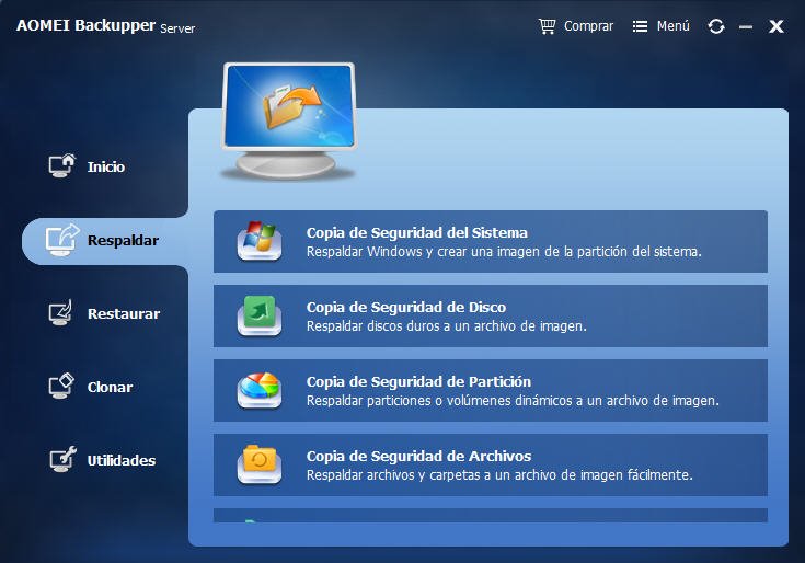 Paso 1. Inicie AOMEI Backupper Server. En la pestaña Respaldar, elija utilizar la Copia de seguridad del sistema, la Copia de seguridad del disco, la Copia de seguridad de las particiones o la Copia de seguridad de los archivos para hacer una copia de seguridad de los servidores. Tomemos como ejemplo la Copia de Seguridad del Sistema.