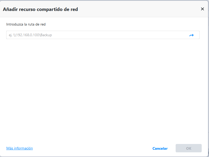 Paso 3. Despliegue el menú desplegable de la segunda barra > seleccione Añadir recurso compartido o dispositivos NAS. Y luego, escribe la ruta de red y selecciona la carpeta compartida que hiciste antes en la ubicación de red.
