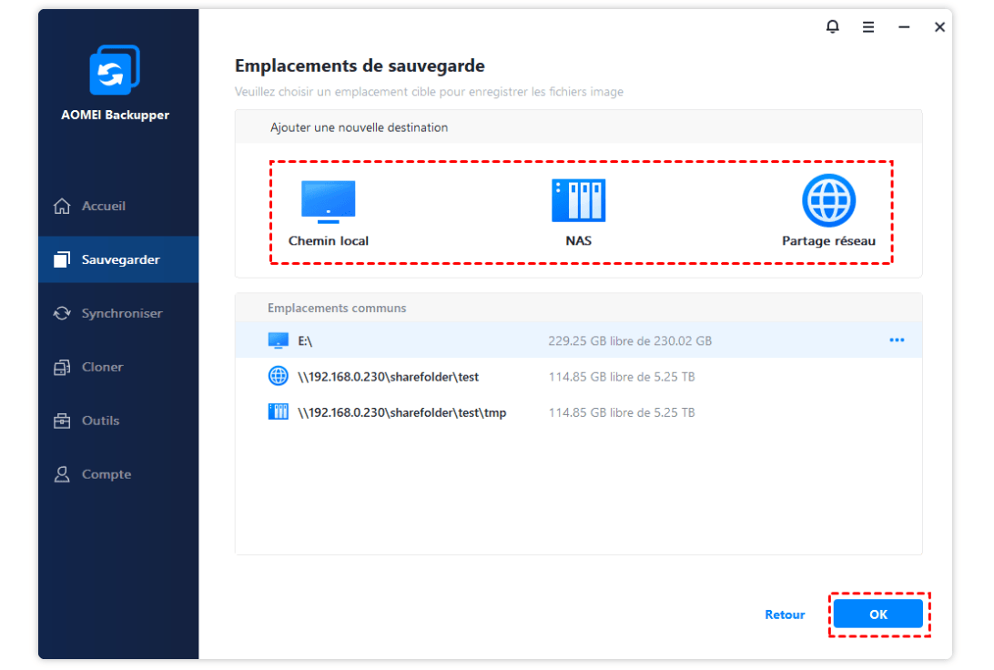 Sélectionnez simplement le chemin de destination pour stocker l'image système.