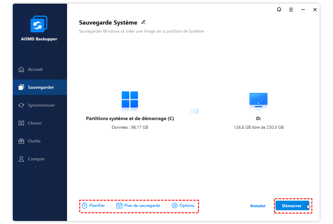 Configurez la tâche de sauvegarde via Plan de sauvegarde ou Planifier si nécessaire, puis cliquez sur « Démarrer ».