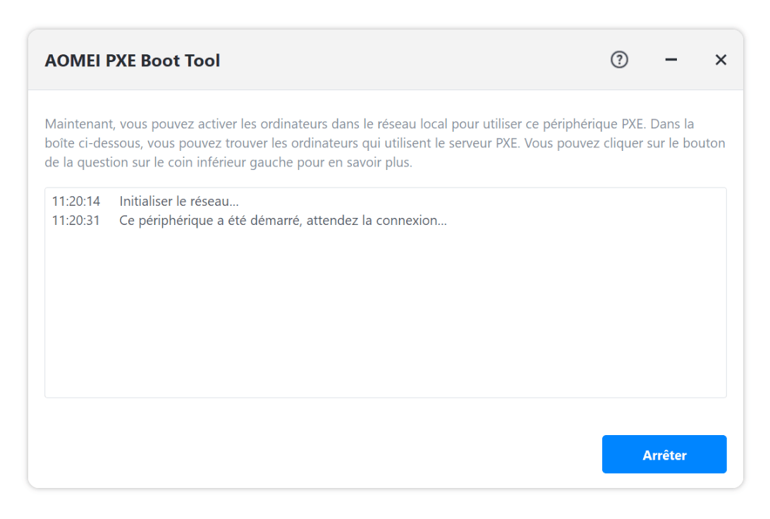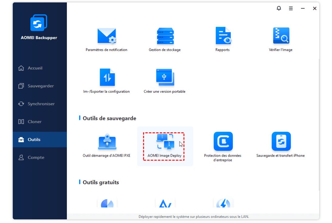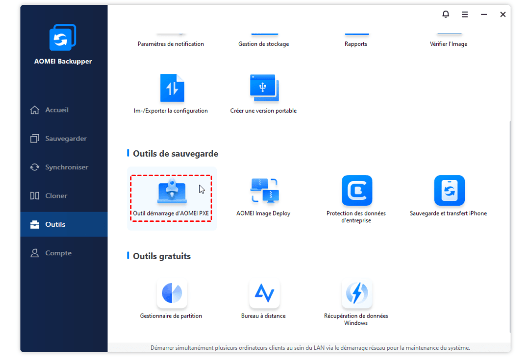 Ouvrez ce logiciel de sauvegarde. Cliquez sur « Outils » -> « Outil démarrage d'AOMEI PXE » et suivez l'assistant.