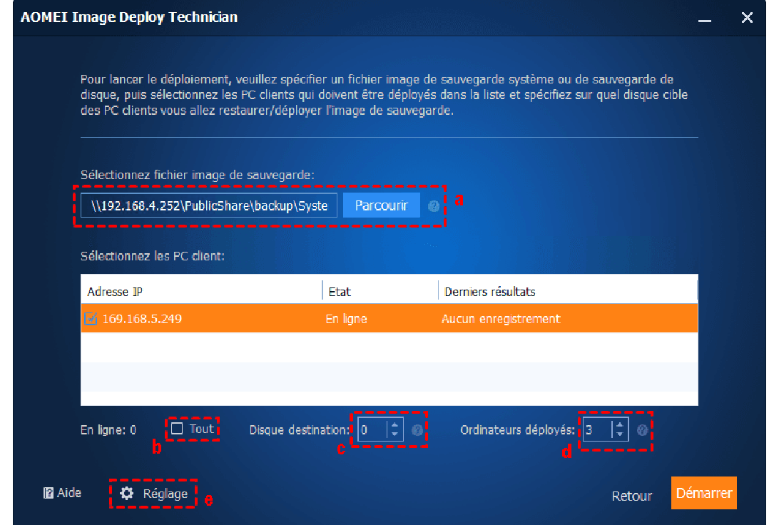 Sélectionnez le fichier image de sauvegarde et configurez les clients. Cliquez enfin sur « Démarrer le déploiement ».