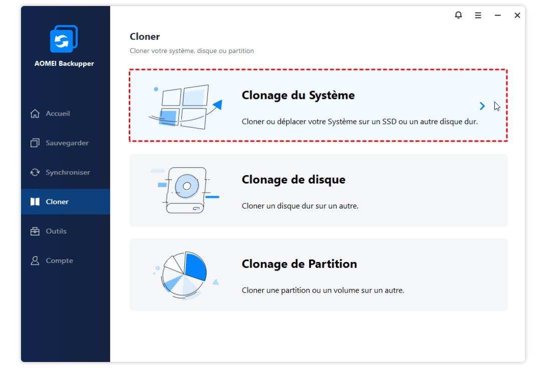 Cliquez sur « Cloner » dans la colonne de gauche puis sélectionnez « Clonage du Système ».