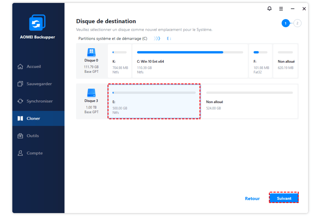 Sélectionnez le disque dur connecté ou le SSD comme emplacement de destination pour cloner votre disque système.