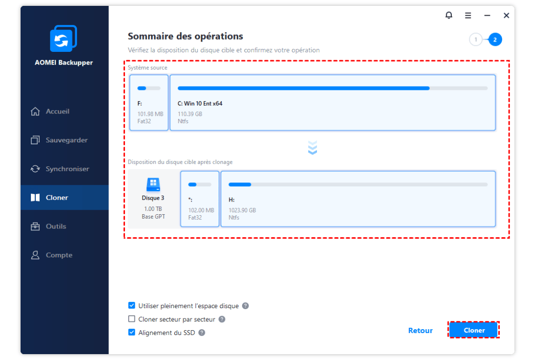 Confirmer les informations du disque et cliquez sur « Cloner » pour effectuer le clonage du système sur SSD ou HDD.