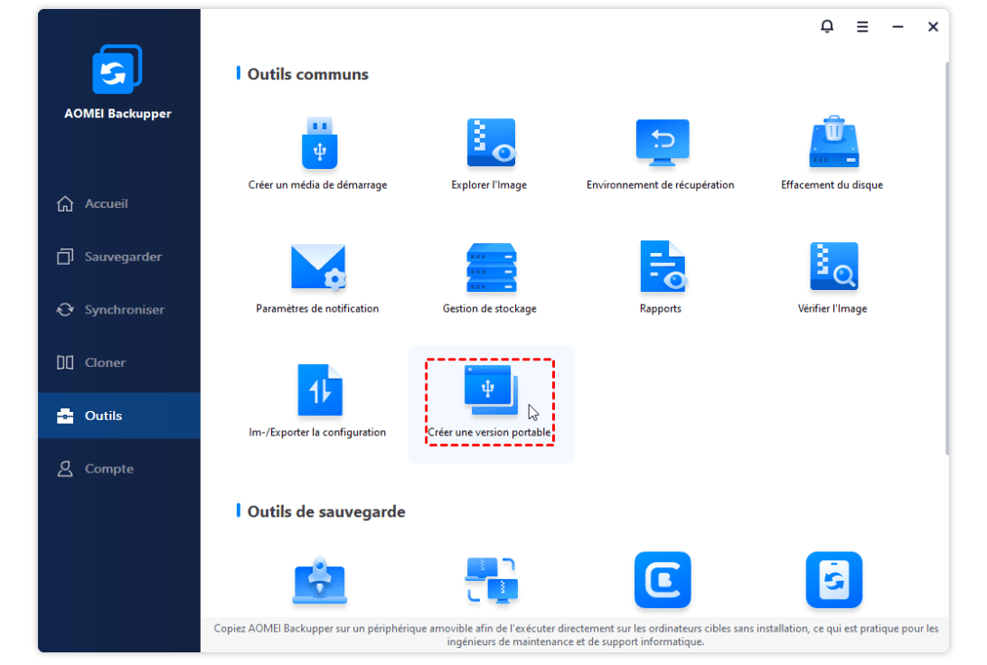 Cliquez sur « Outils » dans l'onglet de gauche, puis sélectionnez l'outil « Créer une version portable » dans la section « Outils communs ».