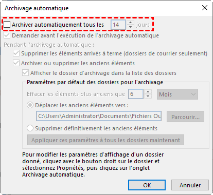 2. Assurez-vous que la case Archiver automatiquement tous les XX jours est cochée et que vous avez configuré la fréquence d'exécution de l'archivage automatique.