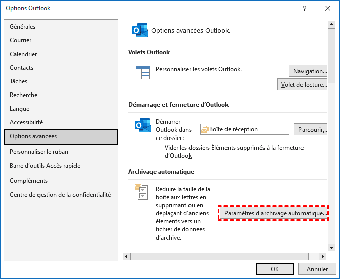 - Outlook 2010/2013/2016/2019 : Fichier > Options > Options Avancé > Paramètres d'archivage automatique.