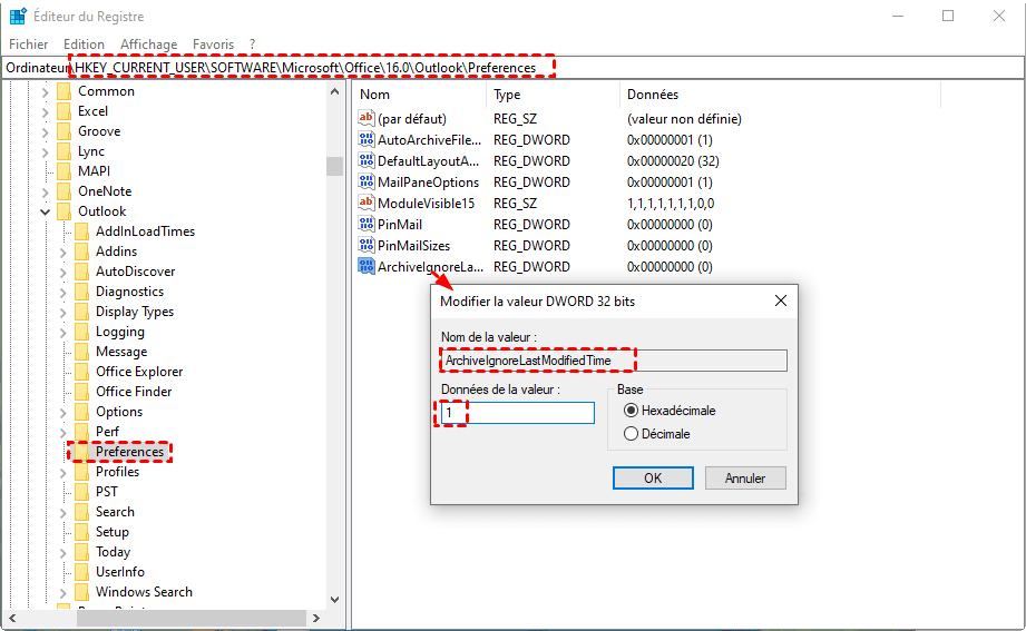 L'archivage Outlook fonctionne en fonction de la date et de l'heure de la dernière modification par défaut. Si vous répondez, transférez, déplacez, modifiez, enregistrez ou importez un élément, la date de modification changera, ce qui peut empêcher l'archivage automatique de l'élément. Si vous souhaitez que Outlook archive les éléments en fonction de la date de réception, vous devez définir la valeur de registre ArchiveIgnoreLastModifiedTime.