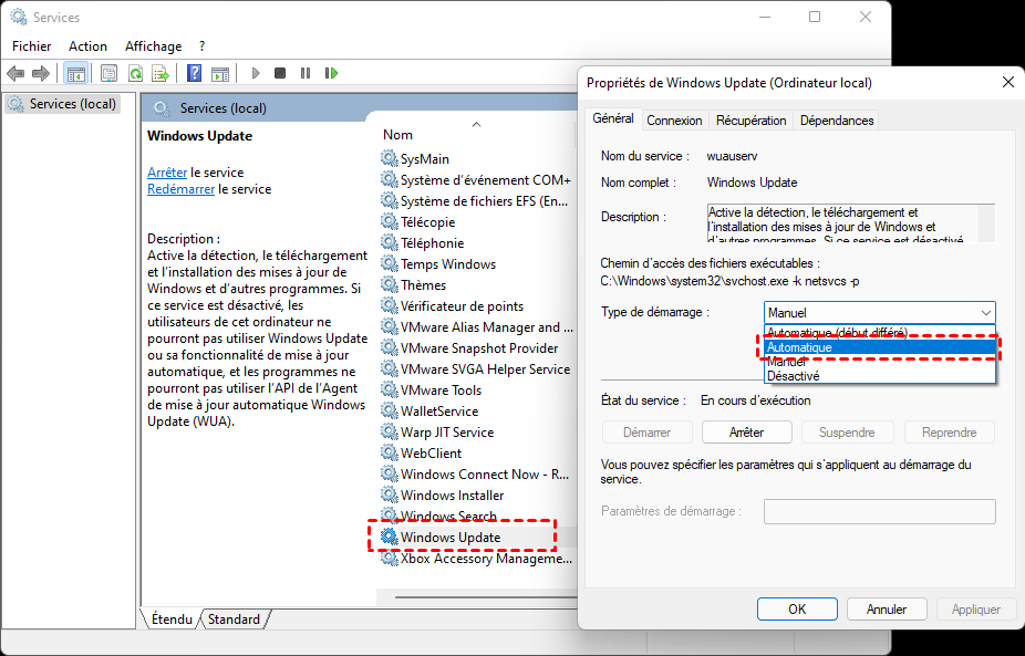 Étape 3. Dans la fenêtre Windows Update, modifiez le type de démarrage sur Automatique, puis cliquez sur les boutons Appliquer et OK pour enregistrer les modifications.