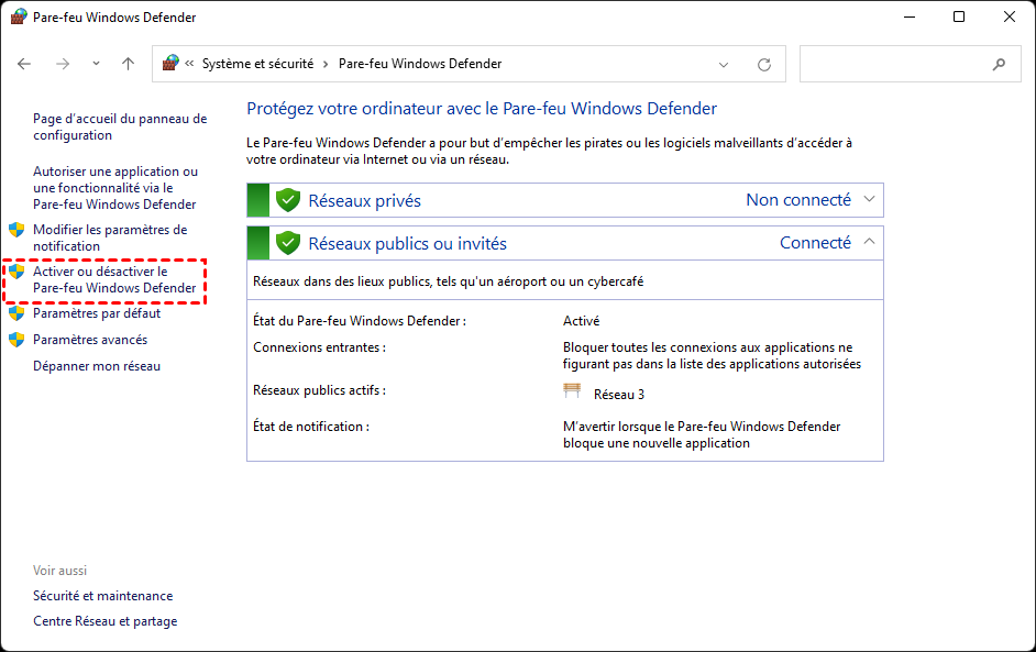 Étape 3. Recherchez et cliquez sur Activer ou désactiver le pare-feu Windows Defender dans le menu de gauche.