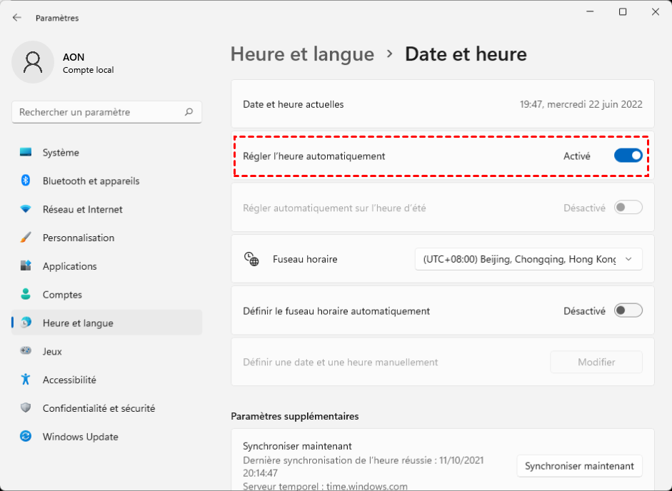 ▸ Pour vérifier l’heure de l’ordinateur : Recherchez et cliquez sur l'option Date & Heure. Vérifiez si la date, l'heure et le fuseau horaire actuellement affichés sont corrects et activez l'option Régler l'heure automatiquement. Redémarrez votre ordinateur et essayez à nouveau d'ouvrir l'application.