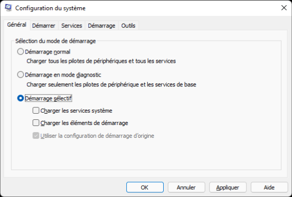Étape 2. Dans la fenêtre Configuration du système, cochez l'option Démarrage sélectif, décochez les cases « Charger les services système » et « Charger les éléments de démarrage », puis cliquez sur le bouton OK.