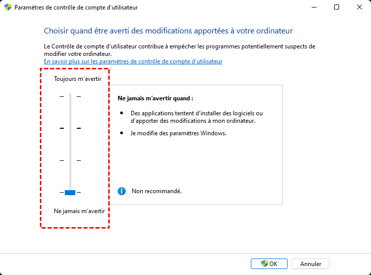 Étape 2. Dans la fenêtre des paramètres de contrôle de compte d'utilisateur, modifiez les paramètres en modifiant la position du curseur. Si le paramètre d'origine est Toujours m’avertir, tirez le curseur vers le bas de Ne jamais m’avertir. Si le paramètre d'origine est Ne jamais m’avertir, tirez le curseur vers le haut de Toujours m’avertir. Lorsque les modifications sont terminées, cliquez sur le bouton OK pour enregistrer les modifications.