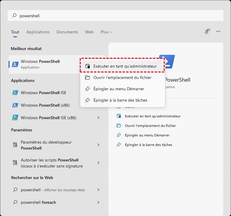 Étape 1. Tapez dans la zone de recherche Windows « powershell », sélectionnez cette application et choisissez Exécuter en tant qu'administrateur.