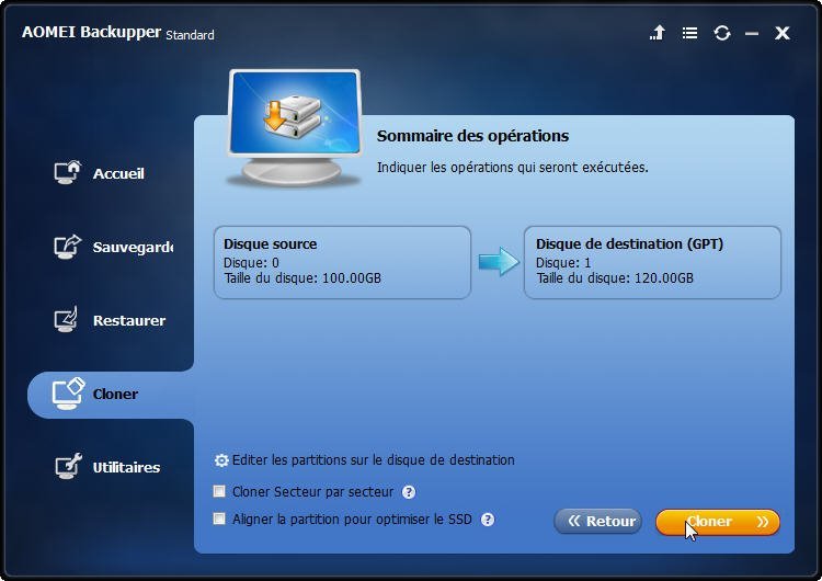 - Si vous clonez vers un SSD, pensez à cocher Alignement du SSD pour optimiser ses performances.