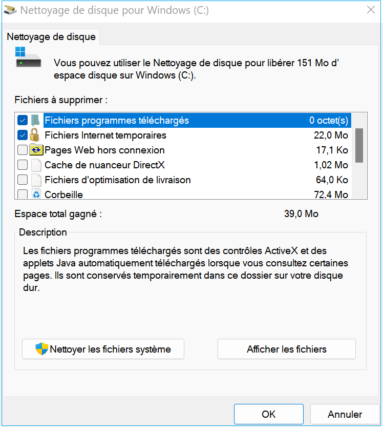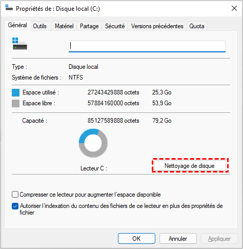 Pour nettoyer les fichiers inutiles et temporaires, vous pouvez utiliser l'outil de Nettoyage de disque.