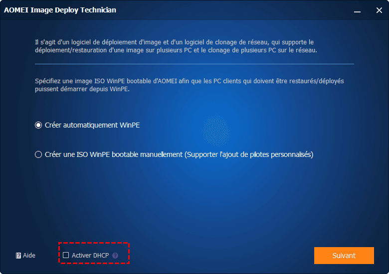 - Téléchargez, installez et lancez l'édition gratuite d'AOMEI Image Deploy sur les ordinateurs serveurs du même réseau local. Ensuite, cliquez sur Créer WinPE automatiquement pour créer un fichier ISO amorçable et cochez Activer DHCP, afin de pouvoir démarrer les ordinateurs clients via le réseau. Ensuite, cliquez sur Suivant.
