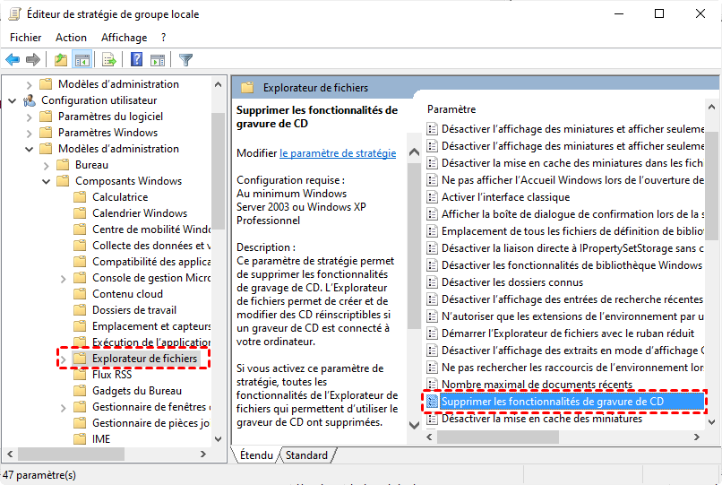 3. Double cliquez sur « Supprimer les fonctionnalités de gravure de CD » et réglez-le sur « Désactivé » ou « Non configuré » pour autoriser la gravure de disque.