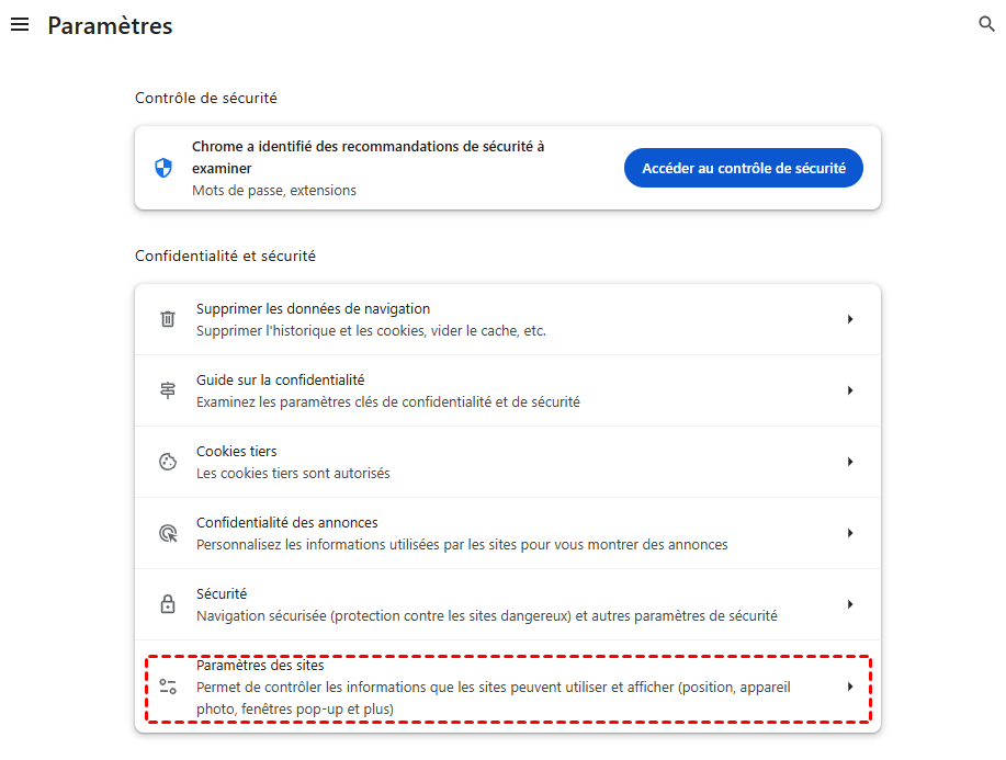 3. Cliquez sur Paramètres des sites, puis sur JavaScript.