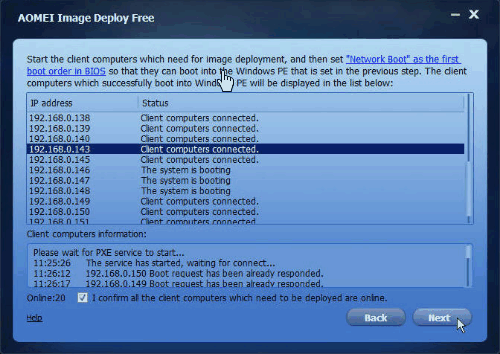 3. Une fois que AOMEI Image Deploy affiche « The service has started, waiting for connect... », démarrez tous les ordinateurs clients et attendez que tous les ordinateurs clients démarrent avec succès. Puis cochez la case « I confirm all the client... » et cliquez sur « Next ».