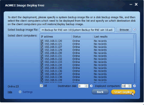 4. Vous devez spécifier l'image que vous souhaitez déployer et configurer la façon de la déployer sur les ordinateurs clients. Ici, on prend le déploiement d'image du système Windows 10 (OS) et 10 ordinateurs pour le déploiement à chaque fois par exemple. Si vous confirmez, cliquez sur « Start Deploy » pour déployer l'image sur les ordinateurs.