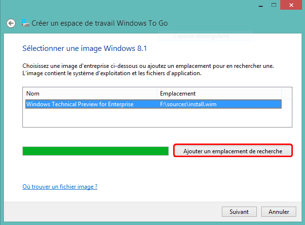 4. Cliquez sur "Ajouter un emplacement de recherche" pour localiser le fichier ISO téléchargé. Sélectionnez le fichier ISO pour rendre votre clé USB bootable.