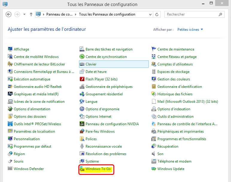 2. Ouvrez le Panneau de configuration. Recherchez la fonctionnalité "Windows To Go" dans le Panneau de configuration et cliquez dessus pour continuer.