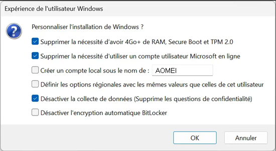 - Désactiver l'encryption automatique BitLocker : empêche l’activation automatique du chiffrement de disque BitLocker pendant l’installation.