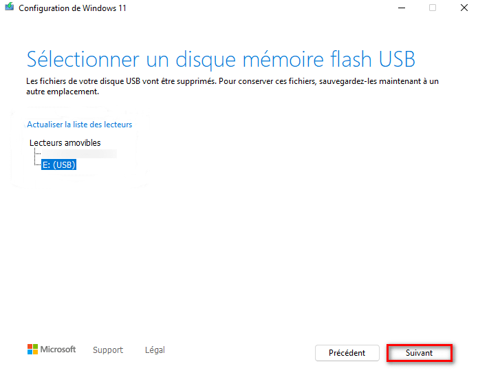 7. Vous verrez une liste des lecteurs amovibles disponibles sur votre ordinateur. Sélectionnez la clé USB que vous venez de connecter et cliquez sur Suivant pour commencer.
