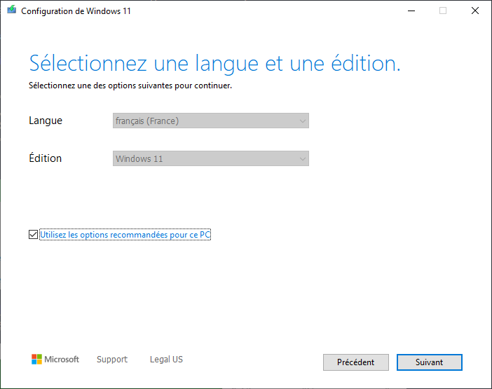 5. Le programme d'installation sélectionne automatiquement la langue, l'édition de Windows 11 en fonction de votre environnement Windows actuel. Vous pouvez également décocher Utiliser les options recommandées pour ce PC et modifier les options par défaut.