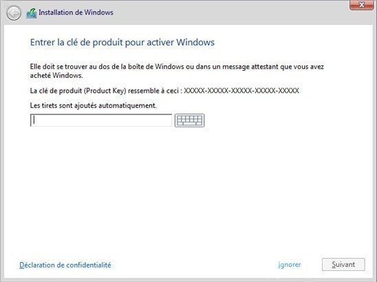 - Ensuite, il vous sera demandé d'entrer la clé de produit (vous pouvez également ignorer cette étape en cliquant sur Ignorer ou Je n'ai pas de clé de produit). Ensuite, vous verrez les termes de la licence, choisissez Accepter et cliquez sur Suivant.